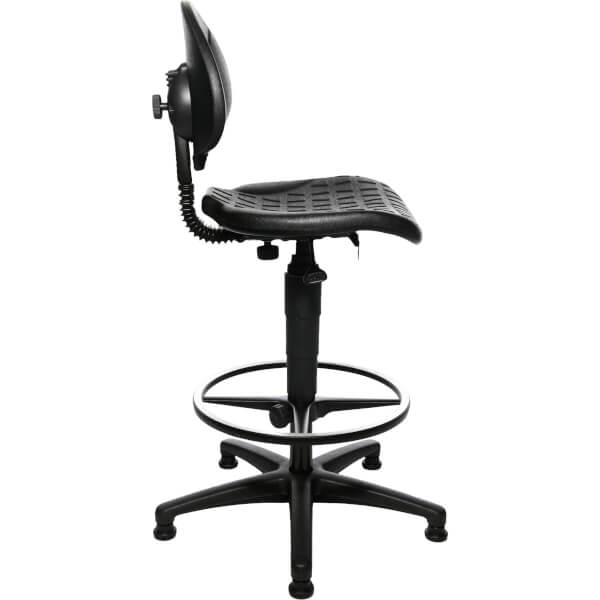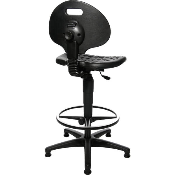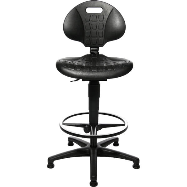 Arbeitsdrehstuhl aus robusten Polyurethan (abwischbar und pflegeleicht) in verschiedenen Sitzhöhen. In niedriger Version mit Rollen ausgestattet für Schreibtische oder in hoher Variante mit Gleitern und Fussring als Stehhilfe geeignet