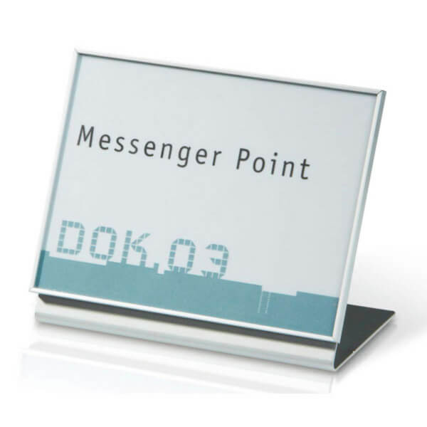 Die nahezu rahmenlos und superflach gebauten Schilder mit robustem Aluminiumprofil und Acrylglasscheibe zeichnen sich besonders durch die hochwertige Verarbeitung aus. Das zeitlose Design fügt sich mühelos in jedes Raumkonzept ein und sorgt für optische Leichtigkeit. Der Fuß aus Aluminium unterstreicht zusätzlich die edle Optik.