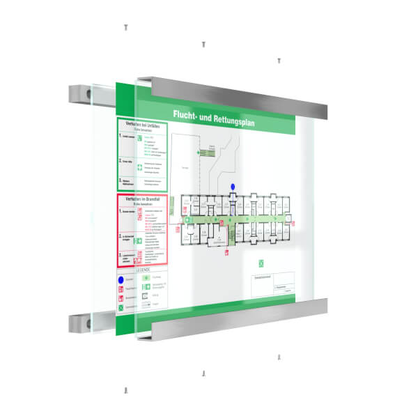 Die ClampLine Serie besticht durch zeitlose Eleganz und ist somit beinahe an jedem Ort einsetzbar. Das Schild selbst besteht aus Sicherheitsglas und wird gehalten von zwei optisch ansprechenden Schildklemmen.