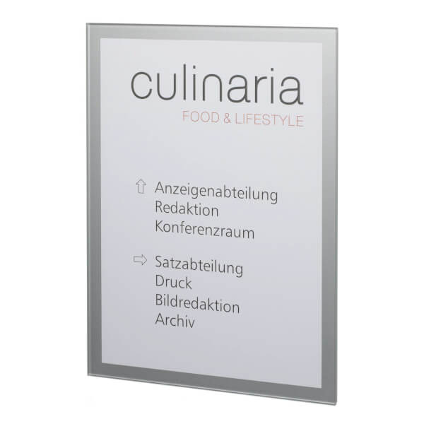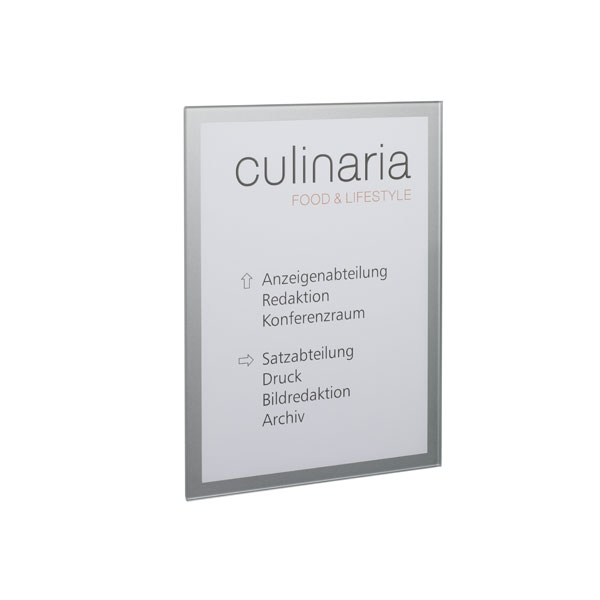 Die Oberfläche aus Einscheiben-Sicherheitsglas ist besonders schlagfest und sorgt neben anderen Materialien wie Aluminium für die Langlebigkeit Ihres Produktes. Der einfache Einlagenwechsel gewährleistet Flexibilität im Informationsaustausch. Die Einlage kann individuell beschriftet werden.
