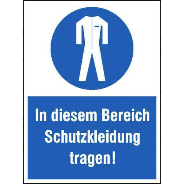 Schutzkleidung schützt mehr als herkömmliche Bekleidung vor gefährlichen Einflüssen wie Hitze, Nässe, Kälte etc., da sie beteiligte Personen vor entsprechenden Gefahren abschirmt. Das Kombi-Gebotsschild In diesem Bereich Schutzkleidung tragen verringert das Unfallrisiko doppelt, da es sowohl mit einem Piktogramm illustriert als auch mit einem Text versehen ist.