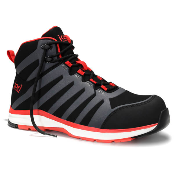 Sportlicher Sicherheitsstiefel mit Kunststoffkappe und Gummiüberkappe.