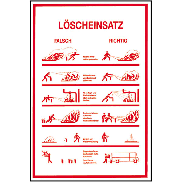 Im Brandfall sollte man wissen, wie man einen Feuerlöscher benutzt. Dieser Aushang unterstützt, beteiligte Personen darin, den Feuerlöscher so anzuwenden, dass er seine optimale Wirkung entfaltet. Neben dem richtigen wird auch das falsche Verhalten auf diesem Aushang abgebildet und erläutert. So wird der Benutzer direkt auf gängige Fehler im Gebrauch eines Feuerlöschers hingewiesen. Der Aushang sollte in unmittelbarer Nähe des Feuerlöschers angebracht werden.
