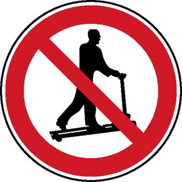 Von der unsachgemäßen Nutzung eines Hubwagens geht eine hohe Unfall- und Verletzungsgefahr aus. Durch das Verbotsschild Mit Hubwagen rollen verboten wird der Transport von Personen mit den Hubwagen untersagt.