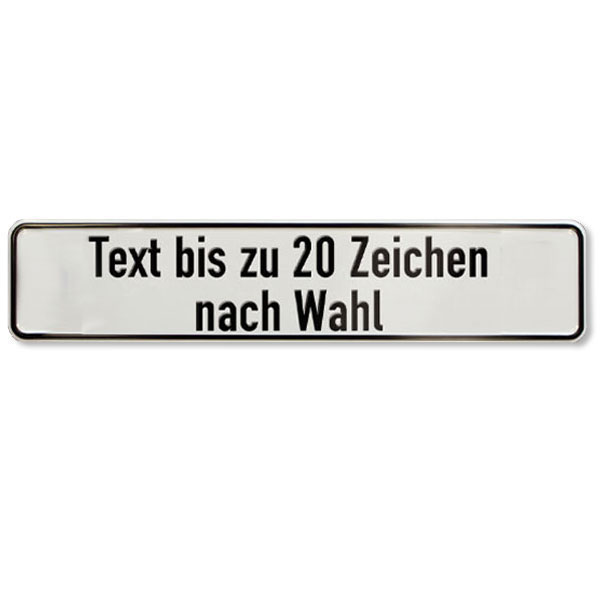 Dieses Schild kann je nach Wunsch mit einem individuellen Text beschriftet werden. Das Schild hat die Form eines Nummernschildes, ist schwarz-weiß und aus Aluminium gefertigt.