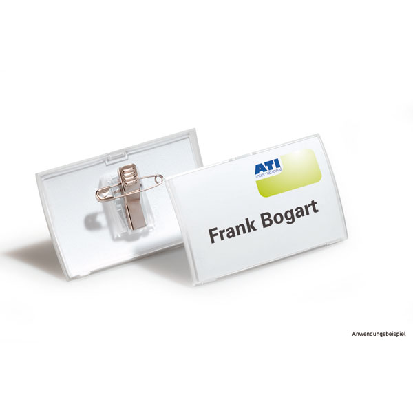 - flexibles Filmscharnier hält die Vorder- und Rückseite des einteiligen Namensschildes zusammen
