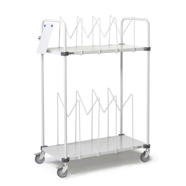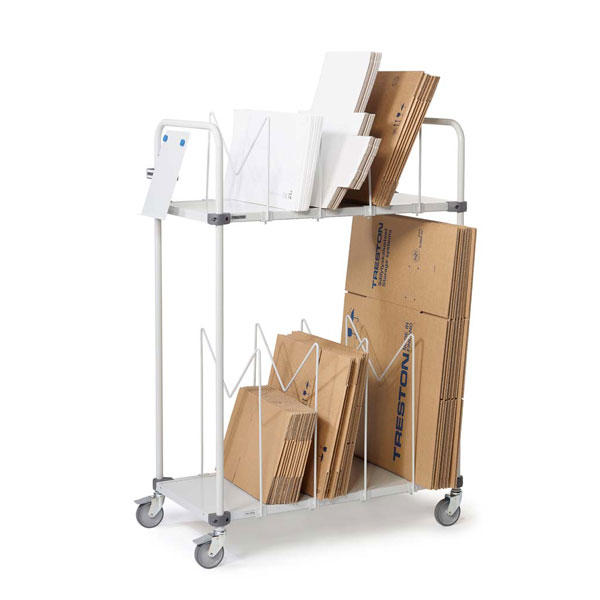Für das Verpacken der Kartons benötigt man Kartons – und davon nicht gerade wenige. Um mehr Ordnung in den Arbeitsprozess zu bringen, empfiehlt sich der Einsatz eines Kartonhalter-Wagens, auf dem Kartons in mehreren Größen Platz finden. Der Wagen verfügt über zwei Etagen, was die Ordnung der Kartons ermöglicht. So empfiehlt es sich, die kleinen Kartons auf die obere und die größeren Kartons auf die untere Etage zu räumen. Dank der vier Lenkrollen kann der Wagen verschoben werden.