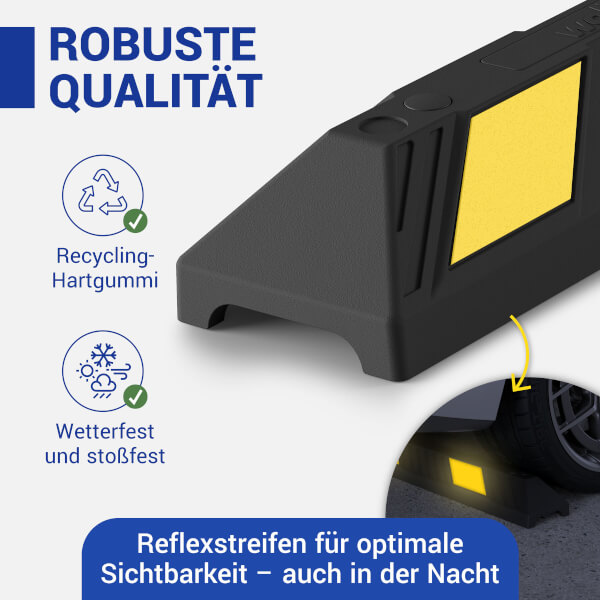 Unser Parkbegrenzer ist mit hochwertigen Reflexstreifen ausgestattet, die für maximale Sichtbarkeit sorgen selbst bei Dunkelheit oder schlechten Wetterverhältnissen. Durch die reflektierende Oberfläche wird das Licht von Fahrzeugscheinwerfern optimal zurückgeworfen, sodass der Begrenzungsbalken frühzeitig wahrgenommen wird. Dies hilft, Kollisionen zu vermeiden und trägt zur sicheren Abgrenzung von Parkflächen, Einfahrten oder anderen Bereichen bei. Ideal für den Einsatz auf Parkplätzen, in Tiefgaragen oder privaten Stellflächen.