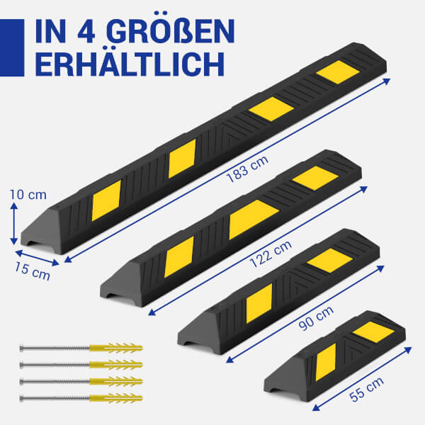 Wählen Sie die ideale Größe für Ihre Bedürfnisse! Unser Radstopp ist in vier verschiedenen Größen erhältlich, um optimal zu Ihrem Fahrzeug oder Ihrer Garage zu passen. Erhältlich in den Größen: