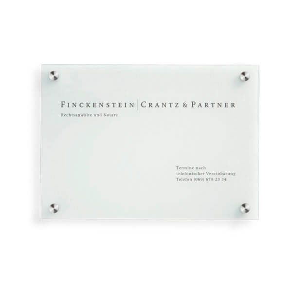 Die Schilder werden aus gehärtetem Einscheiben-Sicherheitsglas (ESG) gefertigt. Bei einem Bruch zerspringt das Glas in viele kleine Bruchstücke, wodurch das Verletzungsrisiko enorm gesenkt wird.