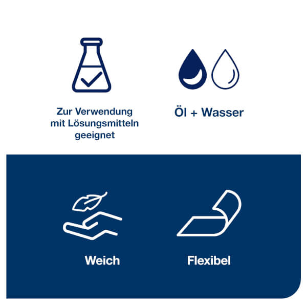 Weiche und flexible Tücher, optimal geeignet für die Reinigung schmaler Spalten und das Entfernen von Öl und Fett. Geeignet für den Umgang mit Lösungsmitteln.