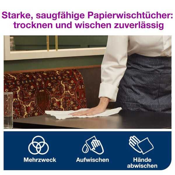 Tork Reflex™ Mehrzweck Papierwischtücher eignen sich aufgrund ihrer Stärke und ihrer hohen Aufnahme besonders gut für Wischarbeiten und zum Abwischen der Hände.