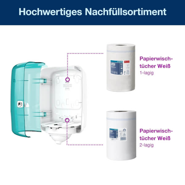 Dieses System mit Einzelblattentnahme kann den Verbrauch im Vergleich zum traditionellen Tork Innenabrollungssystem um bis zu 37 % senken.