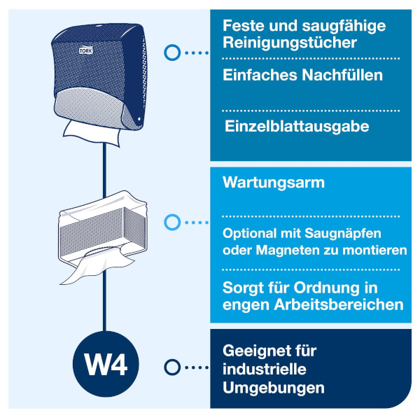 Die Tork Performance Spender und Tork Wisch- und Reinigungstücher ergänzen sich perfekt und werden unterschiedlichsten Anforderungen gerecht: