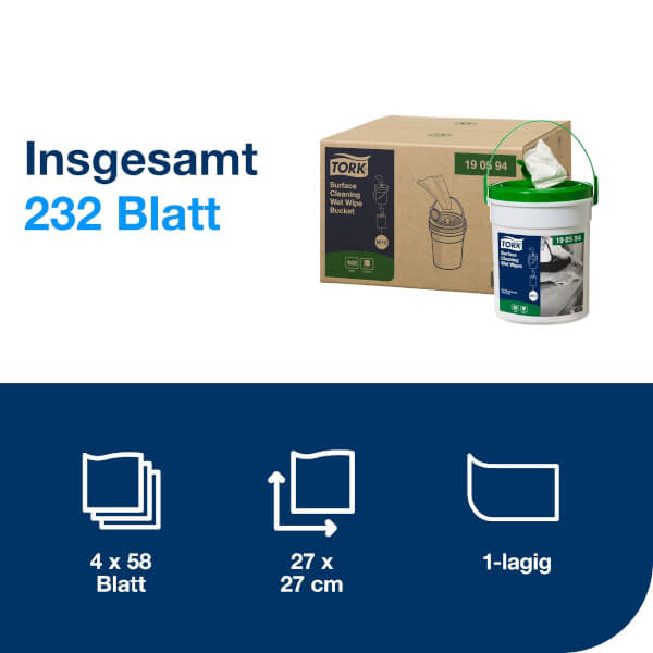 Die feuchten Handreinigungstücher von TORK® sind ideal, wenn am Einsatzort kein Wasser zur Verfügung steht, hier kommen die Tücher gebrauchsfertig im praktischen Eimer und sorgen für eine einfache Reinigung von Oberflächen an allen benötigten Stellen.