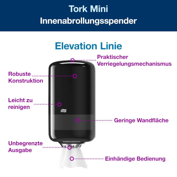 Der Tork Mini Innenabrollungsspender im Elevation Design ist eine kompakte, vielseitige Lösung für professionelle Umfelder, in denen sowohl Hände als auch Oberflächen abgewischt werden müssen.