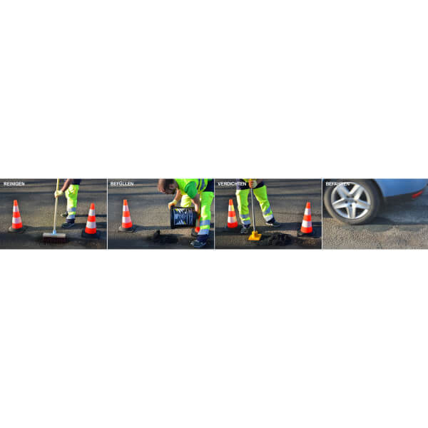 Der gebrauchfertige Kaltasphalt von Ampere® eignet sich ideal um Fahrbahnschäden sowie Schlaglöcher auf Gehwegen, Straßen und Parkplätzen sauber und langfristig auszubessern.