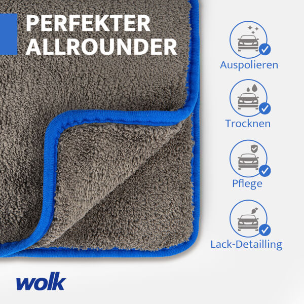 Das professionelle Auto Trockentuch der Qualitätsmarke wolk® profitiert durch eine hohe Grammatur von 1200 GSM und besitzt eine überragende Wasseraufnahme.