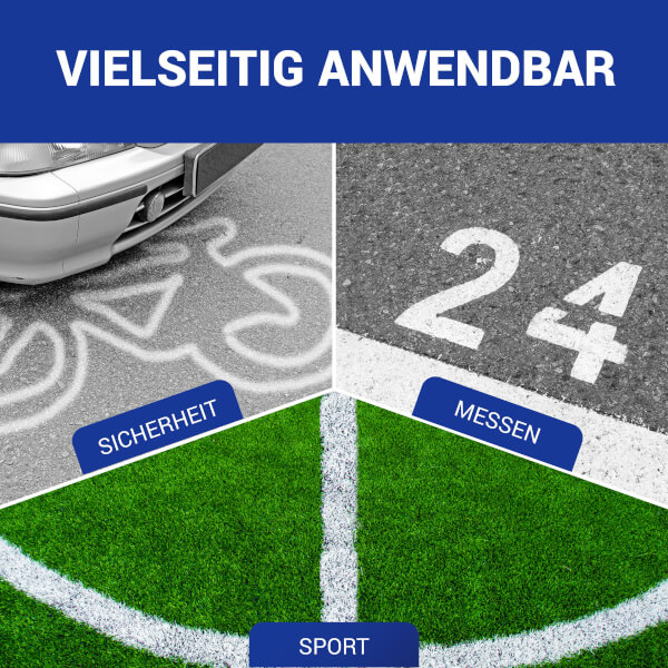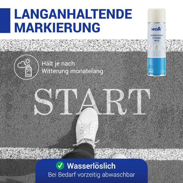 Das wolk® Kreidespray strong eignet sich ideal für sportliche Veranstaltungen, Messen oder Kennzeichnung von Unfallstellen bei denen temporäre Markierungen langhaltend erwünscht sind.